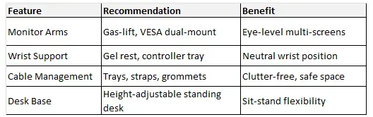 Start with measurements: Desk height at elbow level when seated (28-30 inches), screens arm's length away. Test setups for 30 minutes. Invest gradually—monitor arms first for biggest impact. These changes turn gaming desks into ergonomic powerhouses, letting you play longer without pain. Pair with stretches and hydration for peak performance.