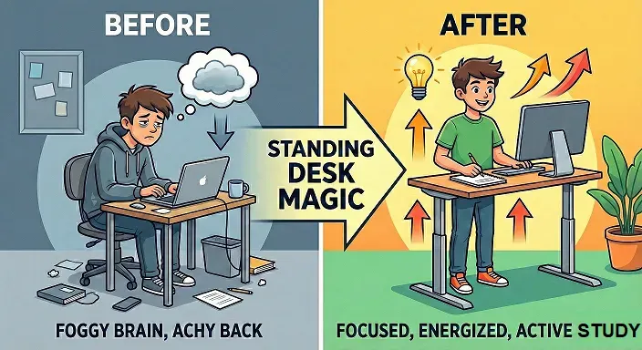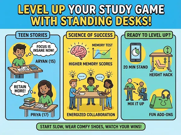 Meet Aryan, a 15-year-old from Mumbai. Glued to his chair, his grades slipped. Switched to a standing desk? "I blast through science notes standing—focus is insane now!" Or Priya, 17, prepping for NEET: "Standing for history revisions kills boredom; I retain more."